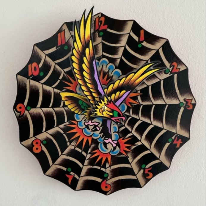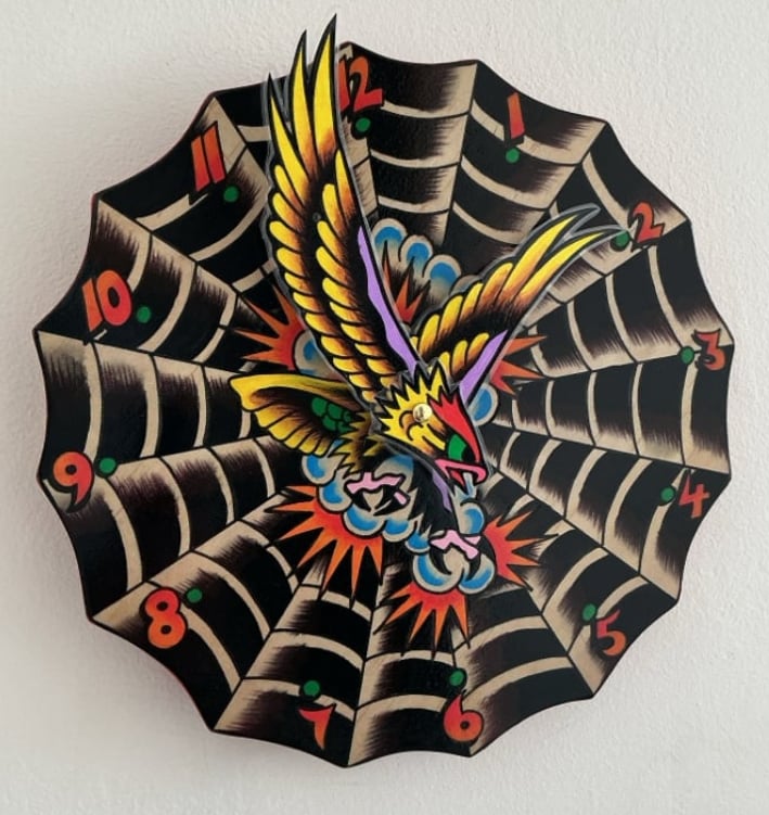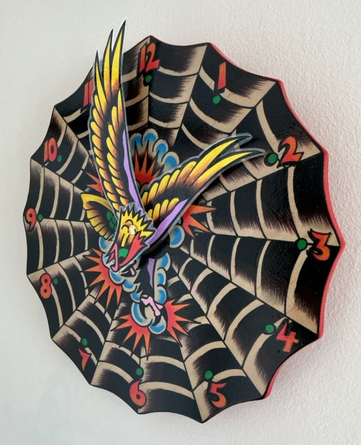 Each clock are hand cut out of premium plywood and hand painted individually. Then varnished and sealed. They are 25cm/25cm.