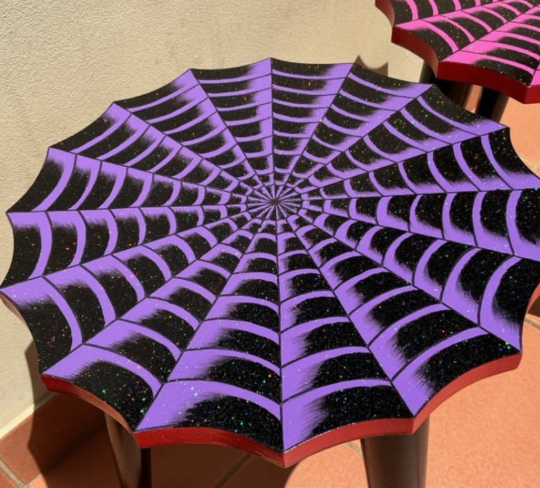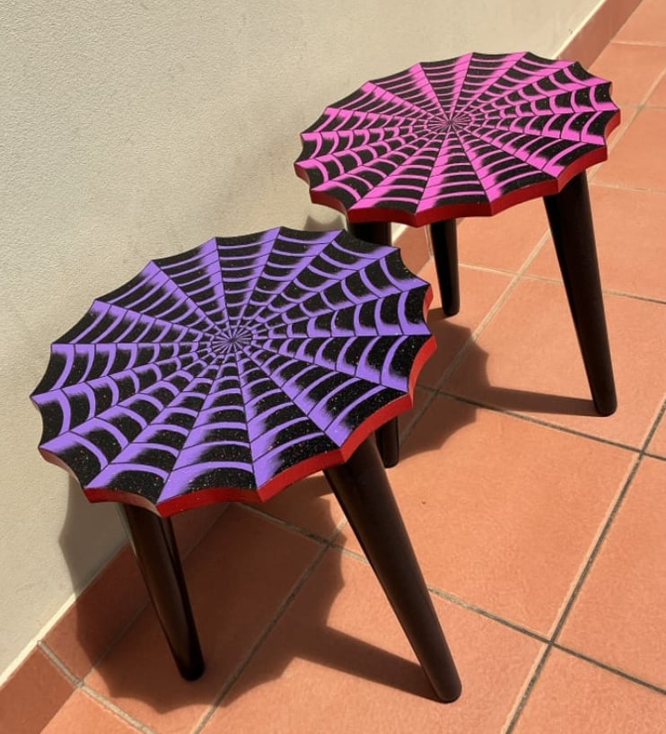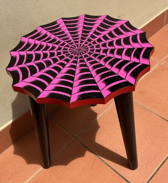 Hand cut and painted side table. Finished with a high gloss varnish. Measurements are 42cm high and the top is 37cm wide. Legs unscrew, easy to transport. Can ship world wide